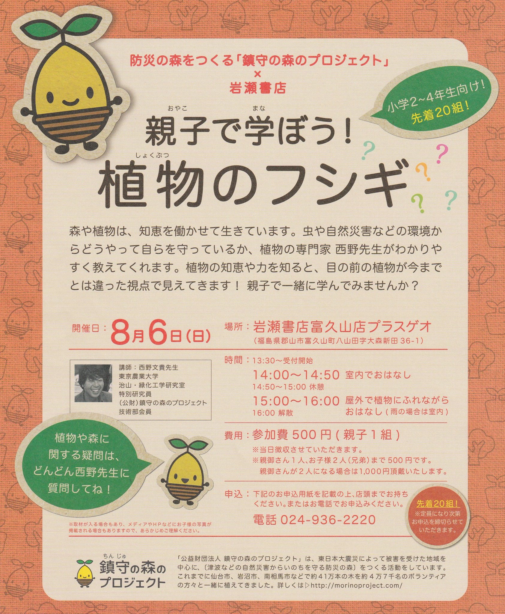 岩瀬書店 Pa Twitter 岩瀬書店富久山店よりお知らせ 8月6日 日 親子で学ぼう 植物のフシギ イベント開催 植物の専門家 西野文貴先生が植物のこと わかりやすく教えてくれます 小学2年 4年生向け 先着20組 参加費は親子1組500円です 鎮守の森